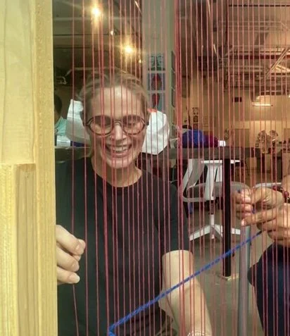 Photo of Allison smiling while stood behind a large wooden loom with red warp threads