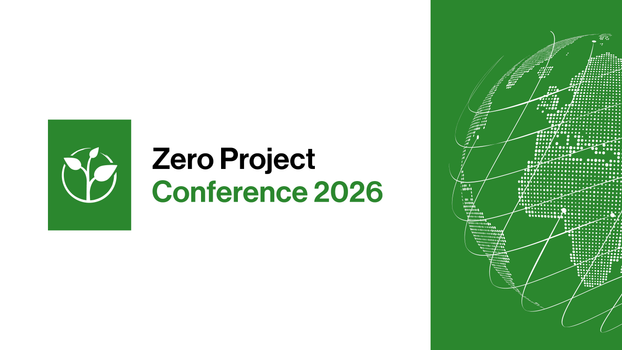 Zero Project Conference 2026 banner. A green and white design featuring a digital globe with network lines on the right and the Zero Project logo with white leaves on green background on the left