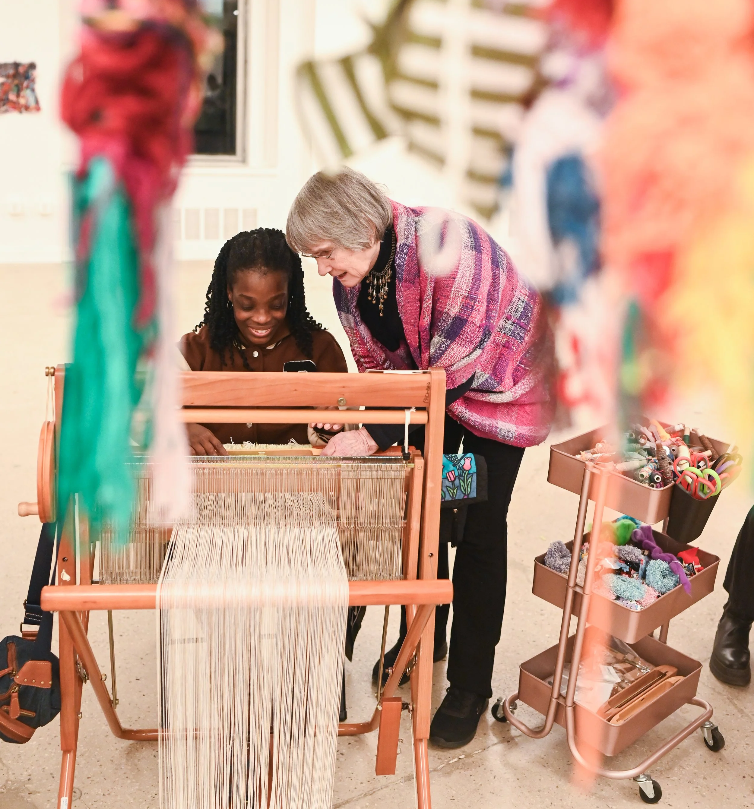 As the title suggests, visitors are welcome to enter, exit, linger, and return to the looms. The gallery operates as a living social sculpture. Free and open to the public, the exhibition invites visitors to weave with support from Intertwine Arts teaching artists, with all materials provided. Over the two-month run of the exhibition, hundreds of visitors are expected through scheduled sessions with partner organizations, as well as independent drop-ins who can book up to two-hour weaving sessions through Intertwine Arts’ website.