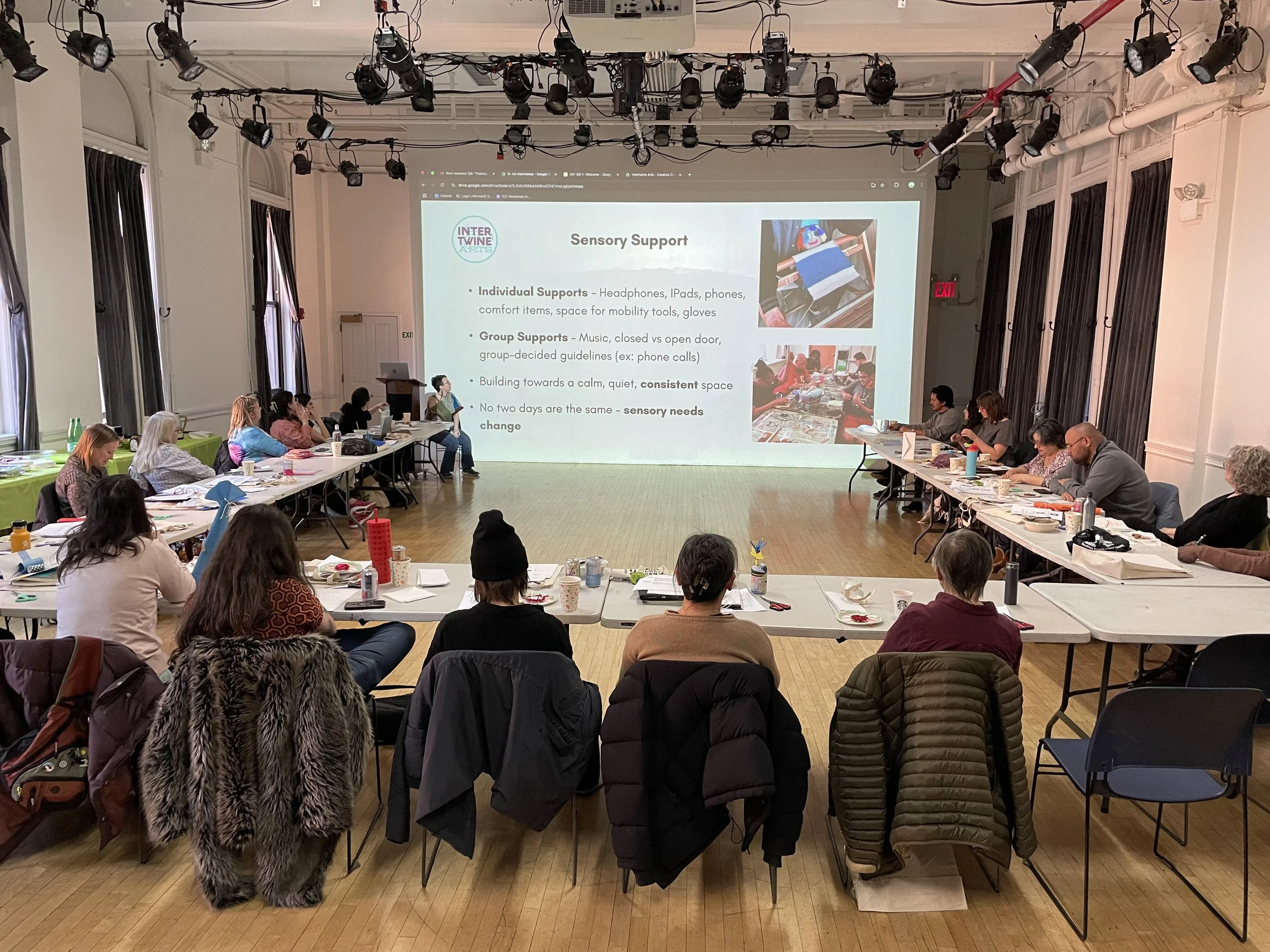 Institute attendees sit at tables arranged in a U shape, while circle weaving on plates. Danaleah presents while seated, referring to a powerpoint presentation on the wall projected against one wall. The slide reads “Sensory Support”.