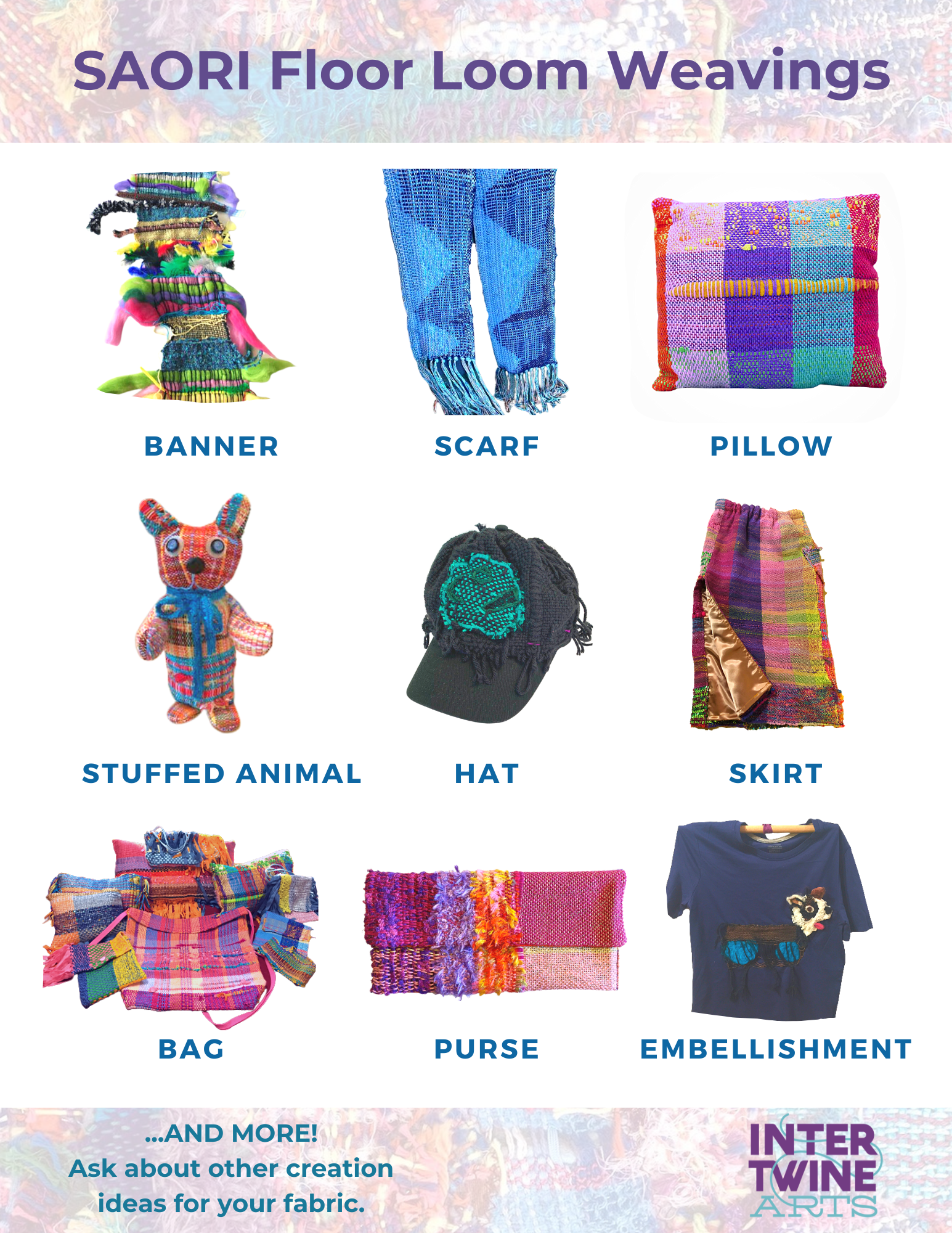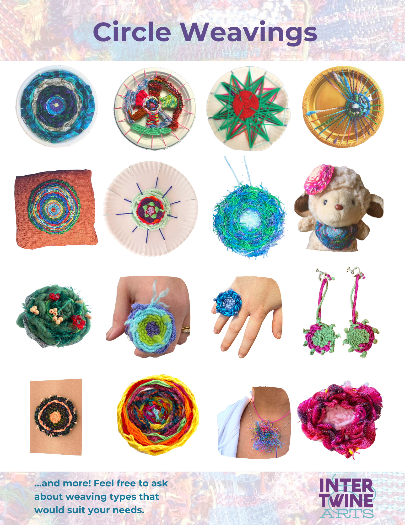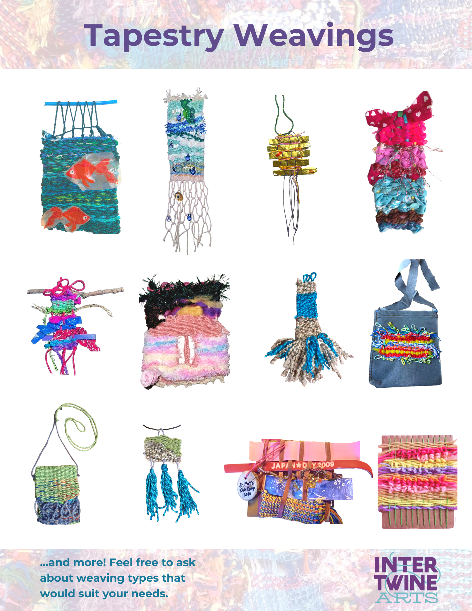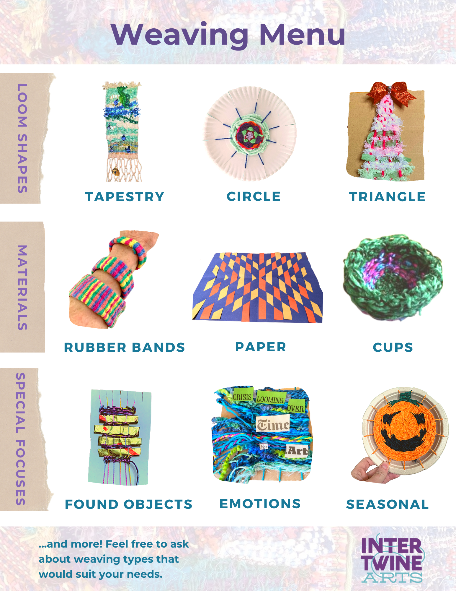 Intertwine Arts offers a variety of in-person and virtual weaving workshops. Below are examples of different projects on offer, as well as the resulting artworks from our programs.